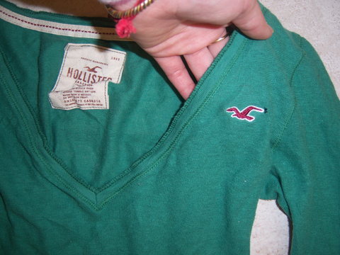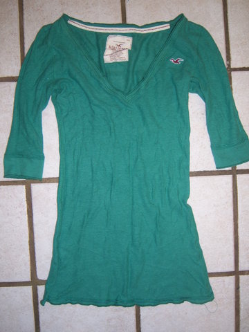 Here's a top by: HOLLISTER. In a very thin and soft fabric. size SMALL, I wore this about 3 to 4 times this past summer. Super comfy on, but I don't like the color anymore. (Please note that there's a hold next to the seagull) You can probably sew it together with a matching color thread. Overall, Good condition.