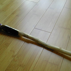 Handmade Wiccan ritual wand, carved from rowan wood (mountain ash) with runes burned into the handle, raw quartz crystal point, wrapped with linen cord, copper band with chakra stones, feathers