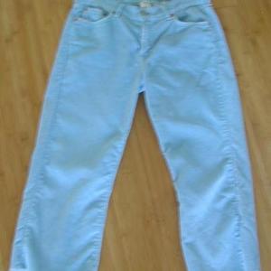 100% cotton, made in USA, designed distress at pockets and zipper front, five-pocket riveted, "Lucky Brand Dungarees by Gene Montesano"