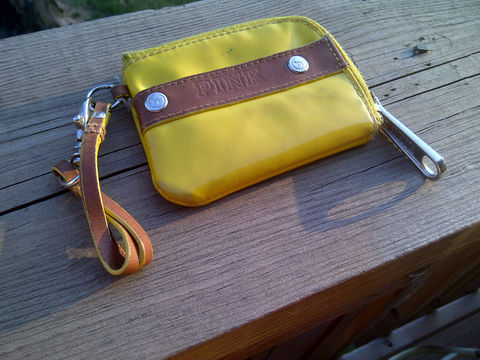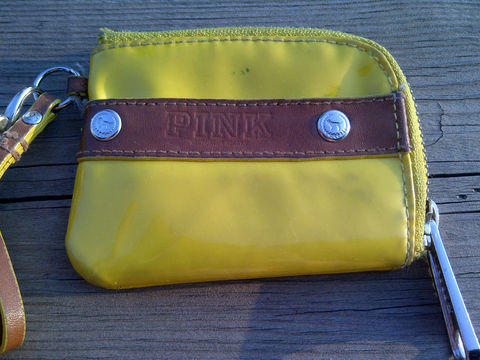 Purchased at Victoria's Secret Pink. It's very easy-to carry. I'd clip my keys on it and just use it as a wallet. It does, however, show signs of wear. Nothing too bad though. No rips.