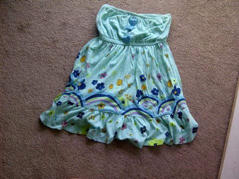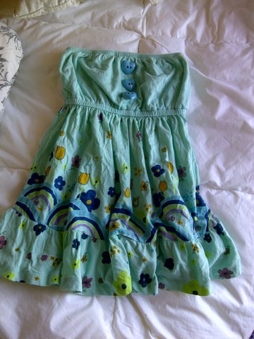 I'm 5" so it looks more like a dress on me, which is why I bought it, but it doesn't fit me right in the chest area. It originally came with a belt but I think it looks much better without it. Other than that, it looks unworn. Made with 100% cotton.