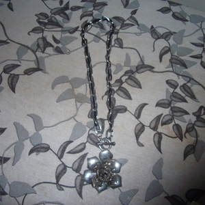 Bought from specialist craft stall in uk. mostly silver colour, black ribbon through chain. never worn.Rose not really heavy.