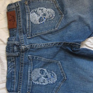 These are super cute! I bought them in Panama. Company is "Bisou Bisou." The back pockets have embroidered skulls. They fall about mid-calf. Marked "9-10" but fit like 1.
