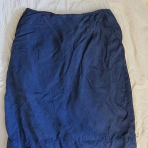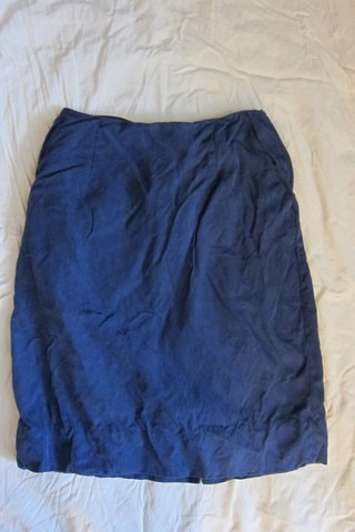 I love this skirt... it's a suede-like fabric, blue. It needs some ironing, but that's about it! You can see the bottom hem is ruched a little... when you wear it though it stretches and is fine. There is a small slit in the back, and it also has pockets. It's a small 4.