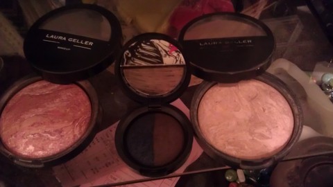 Containers show wear. Lids have detached on blush n powder. Eyeshadow is like new blush n powder used about 80% left