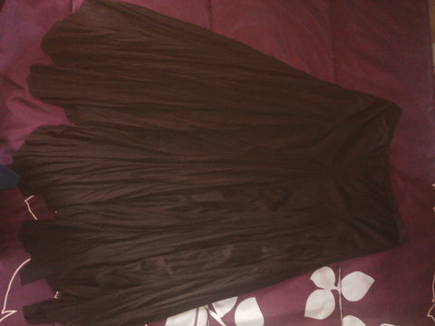 Cute skirt! Its dark brown. It says size small but fits me nicely and I am size medium.It goes down to the calves. This was actually pretty expensive.