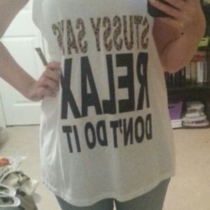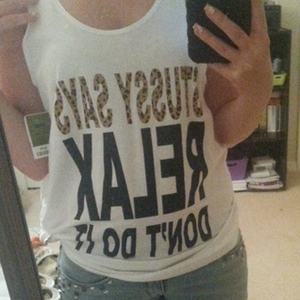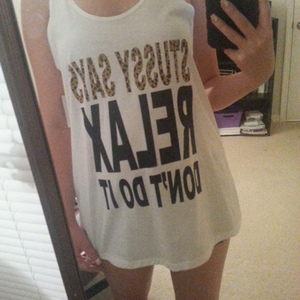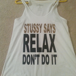 New with tags, worn only for this picture. Its a large, but I was going to use it as a bathing suit cover up. Says in cheetah print and in black "stussy says relax". Muscle tee style tank.