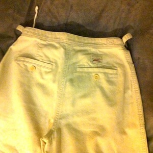 100% cotton in a classy, micro-rib twill. Side vents at the below-the-knee hem. Side pockets and button-through back pockets. I love the unique front closure, which is a streamlined metal clamp: I don't know what to call it, because I've never seen a closure like it! Light tan Ralph Lauren short pants or long shorts. Whether you want to call them "capris", "clamdiggers", or "crop pants", these are that perfect in-between when shorts aren't appropriate (or are too cool) but pants aren't right, either. The fabric has a subtle pinwale ridging to it, which gives them a soft, but not worn, texture. Side pockets and back pockets, side vents on legs and a tab front closed with a small, decorative metal catch. Adjustable D- rings on sides (small). 100% cotton, machine wash and dry. 2 Petite, it's also good for a curvy size 0 gal. I wear a 0 or XS, but these are cut for someone who is more curvy than me.