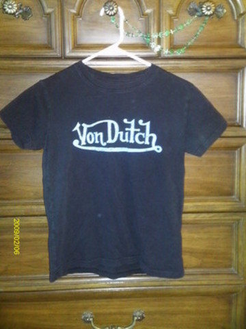This is a really comfy black tee that says Von Dutch in a gorgeous blue color. The color has that cracked looked to it (it's supposed to). Its a size small. There is a small hole in the back top that isn't really noticeable. It is in great condition otherwise.