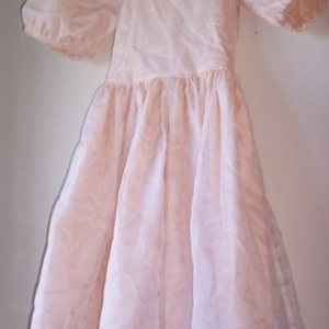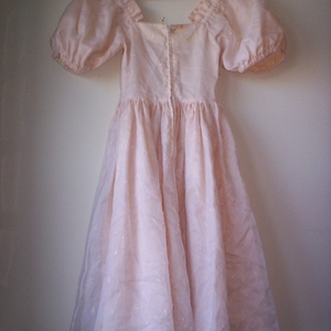 Little girls formal type gown. Do it your self Halloween costume. Use your imagination. Could use for Cinderella, princess Little Bo-Peep. Just add hat gloves, jewelry and what-ever else to get the effect you're looking for. No tag. I would think it would fit 8-10yr old toddler depending on her size. Length measures 31 inches from top of bust to bottom of skirt. Underarm to underarm is 12 inches. Waist is 11.5 across. The back zipper is 14 inches long. The skirt is very wide it measures 54" pulled out to the side. Great for twirling around. And cute puffed sleeves. Pink dress with little shiny pink flecks on outer skirt. Is fully lined. Has been sitting in a drawer with other costumes. Could use a hand wash or dry cleaning.