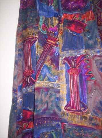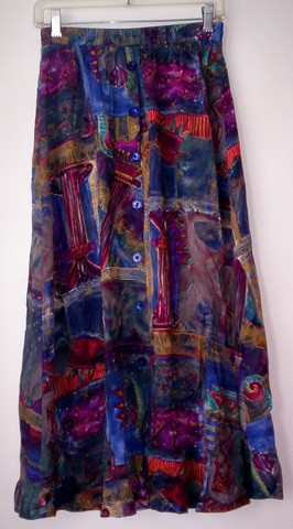 Womens Medium Multi Colored Skirt. Interesting & artistic. Elastic waist and buttons all the way up. By Susan Burrowes 100% Rayon.