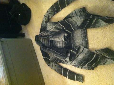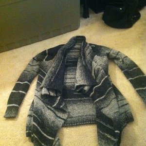 Never worn. Black and grey. Super cute and comfy, I just have another one almost exactly like it. Hangs down a lot in the front where It hangs open