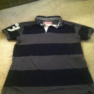 Sized a large but I think it is more a s/m. Black and grey stripes. Has a white 43 stitched on the sleeve
