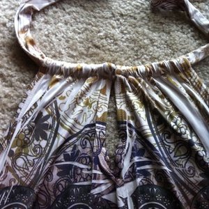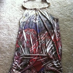 Perfect condition as far as I can tell, I just want something new. Several colors (orange, green, maroons, white, purple..) in a cool design. Ties up behind the neck and has a key hole at the neck. shows off the upper back. has cinching around the bottom.