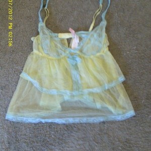 NWT Victoria's Secret yellow with blue trim lingerie top, like a babydoll. Supposed to be a set, but it only comes with the top part, no thong. Size 34B. 100% nylon. It measures approximately 13 inches across. Straps are adjustable. It measures approximately 19.5 inches from top to bottom.