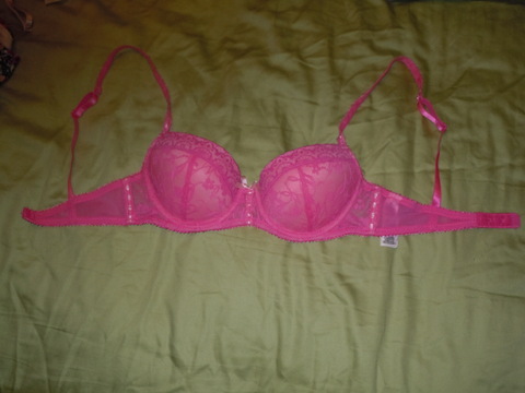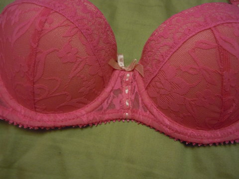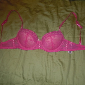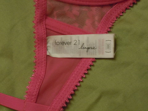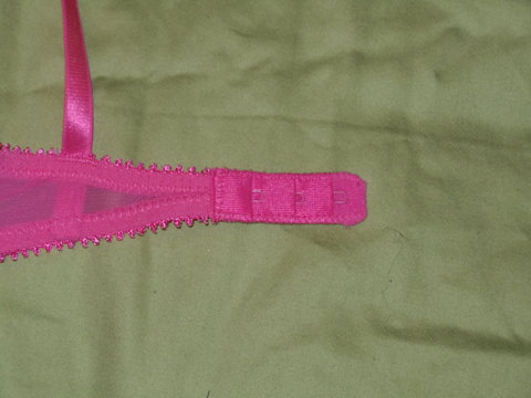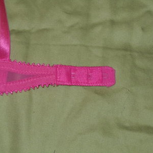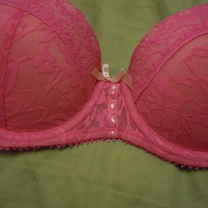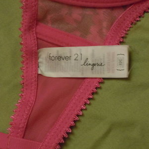 Haven't worn it because it's too small for me and I couldn't return or exchange it at F21! It's a super sweet neony-hot pink over a light girly pink! Cute little bow inbetween the cups and ribbon laced into the straps. 3 rows of one hook for adjustment. Adjustable straps The lighter colored pictures are closest to the actual color!
