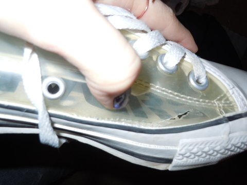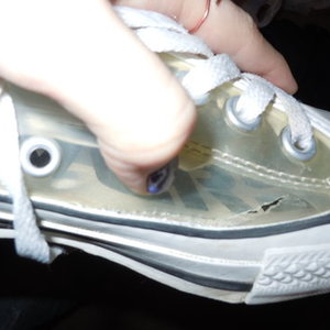 These have been worn maybe 3 times. Somehow I managed to rip the plastic on the side of one shoe. This should be pretty easy to repair, (thread or glue??), but I don't know where to start! Otherwise these shoes are so cool! They are no longer sold in stores or online and they retailed for 60$ for the adult pair. Socks can be seen through these shoes, so I always wore neon ones, changing up the color of my shoes each day I wore them :) They need a good home :)