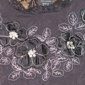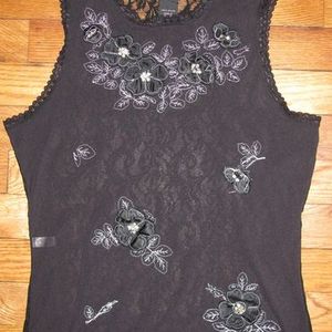 Black tank top from Express. Size Medium. The front half is black mesh, it has flowers stitched on the front. The back is black lace. (In the pics both layers sort of show up because of the flash) thisbug