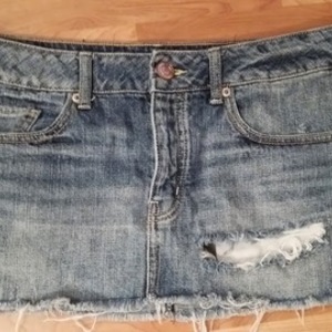 Only worn a couple times American Eagle size 6 denim factory distressed skirt. Measures 10.5" length and waist is 30"