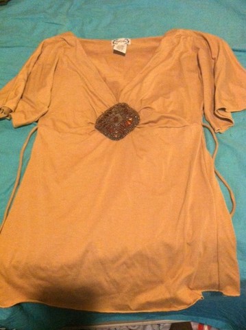 little beads make the broach. ties in the black with a deep v neck and fluttery sleeves. will probably fit an xs as well.