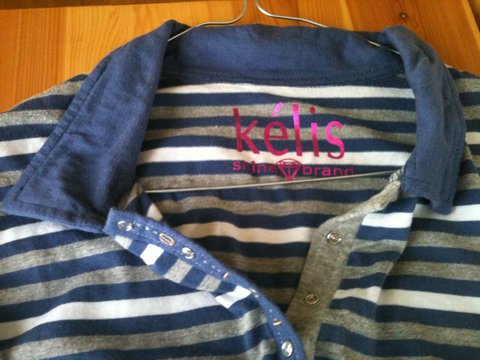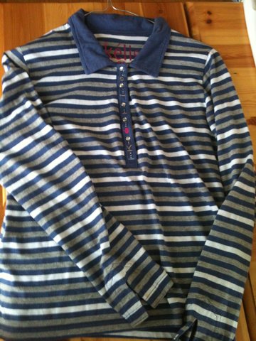 Striped kélis blue-white-grey shirt with collar 100%cotton buttons down the front with cute rhinestone buttons. size medium, fits a loose s. Well worn.