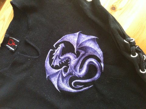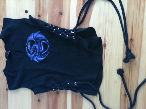 V-neck black and purple dragon top, ties on sides with strings, size xs