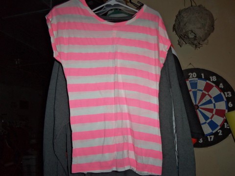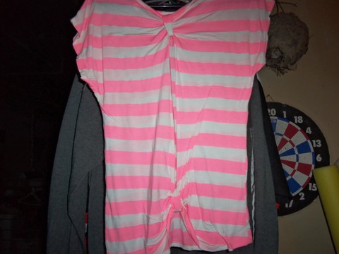 i got this shirt and debs it is a size small. i wore it only a couple times and its been in my closet ever since. the back of the shirt is open down the middle.