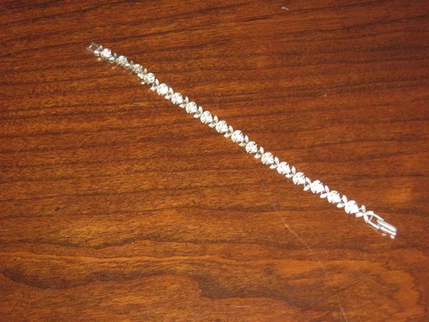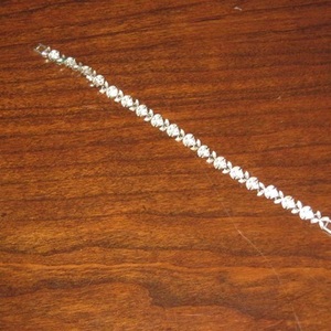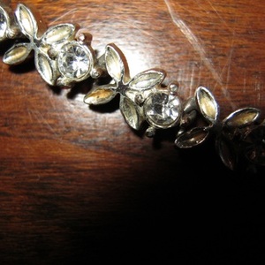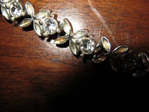 A small silver anklet with clear gemstones. Will need a polish (I do not wear jewelry so I cannot do this before shipping...no tools) It was a gift and I don't know much else about it so I have labelled it as good. Took one distance and once close up shot.