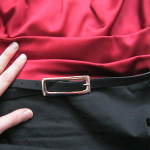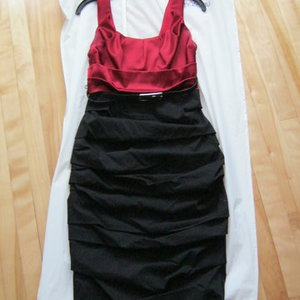 Le Chateau red and black "business" dress. Only wore twice and then I out grew it. Bought for nearly $200 so I won't let this go lightly. Red shiny fabric on the top with layers and black stretchy fabric on the bottom with layers. The layers are all just folded over fabric (not different pieces). Fits the body nicely. Comes with the belt shown but does not have to be worn with it. May need to be ironed or flattened after shipping. WILL SEND WITH DRESS BAG IT CAME IN (the one it is sitting on in the picture).
