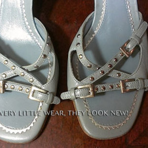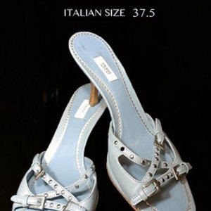 Bottoms look barely worn. Super cute strappy kitten heels in a steel blue color. Made in Italy, so it is UK size. Does come from a SMOKING home, however I have been selling/trading for years and never had a complaint, I deodorize before sending out and pack in a dryer sheet!