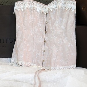 NWOT Blush Pink with Lace detail corset/bustier. Full back lace up makes it easy to adjust the size. Will fit 36 and up, Cup size C and up. Does come from a SMOKING home, however I have been selling/trading for years and never had a complaint, I deodorize before sending out and pack in a dryer sheet!