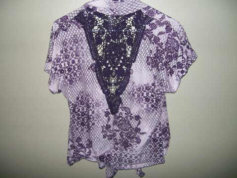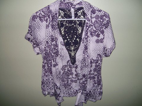 More of a over shirt it is purple and white with a cool pattern all over and a cute lacy V pattern in the back. Full Tilt Brand.
