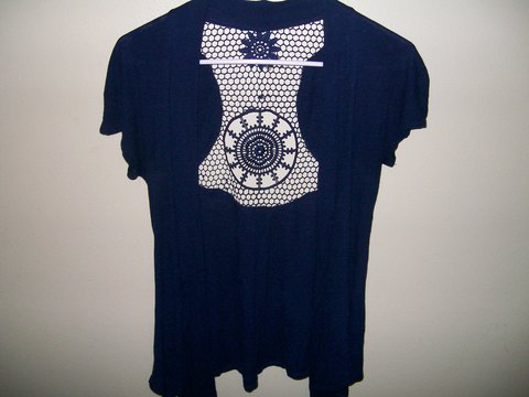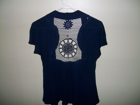 All the tags are taken off of it so I am not sure what brand it is. But it is a stretchy material, dark blue in color with a cute netted pattern in the back. It is definitely a over top. Short sleeved. Fits me like a medium.