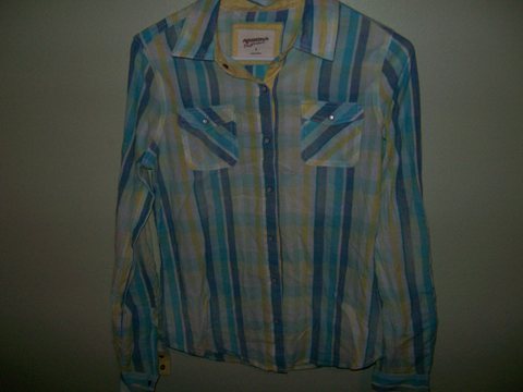 Hardly worn Arizona Jean Co. brand button up shirt. Long sleeved can be rolled up. Overlays of blues and yellows. Fits me like a comfortable medium but is a small.