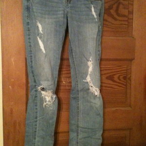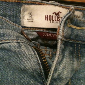 #Hey "Bettys". You know you love the bass-blaring, perfume-hazy cavern that is Hollister. Here are the super skinny, light wash jeans. #The holes are strategically placed, as with the tears. They are broken in and stretched out but can be shrunk #They are low-rise, but very comfortable and super sexy. #Originally bought from Hollister over a year ago. Great condition, no stains.