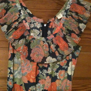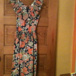 #People are gonna wonder where you got this adorable dress! It's a full length maxi dress, blue with orange and pink floral detail #Purchased from Buffalo Exchange in Chicago last Spring Break #Excellent condition, freying is normal, no size tag but definitely a small.