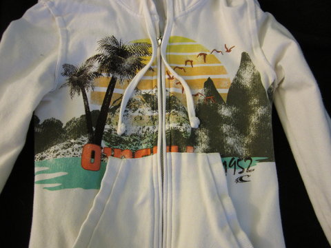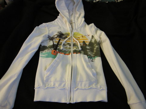 white sweatshirt from oneil. cute beach design on the front. there is a small rip under the arm pit but it isnt noticeable, plus it can be fixed in like 2 seconds.