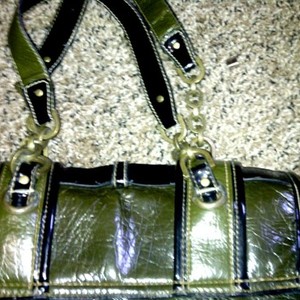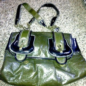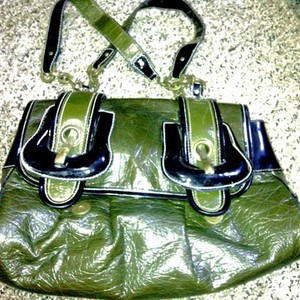 Cute larger green leather purse. Handle attached with chains/hoops. Nice condition