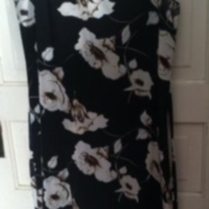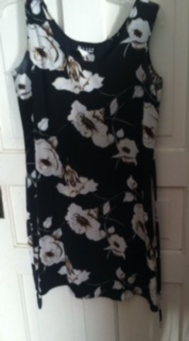 the photo doesn't show it, but this dress does have a nice flirty shape to it once tied in the back. brown/black/white. easy to either dress up or dress down as a shift dress untied- it hits above the knee and the neckline hits a bit below the collarbone. i wore it once to a wedding.