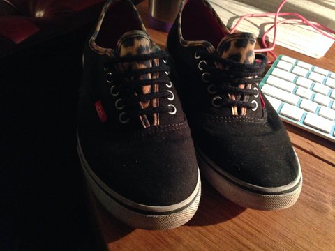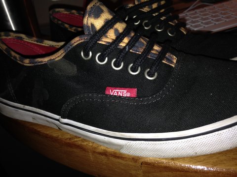 Black womens lo-pro vans with leopard print insides. Super cute. There's a couple dirty spots but can easily be cleaned up.