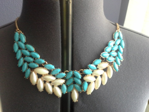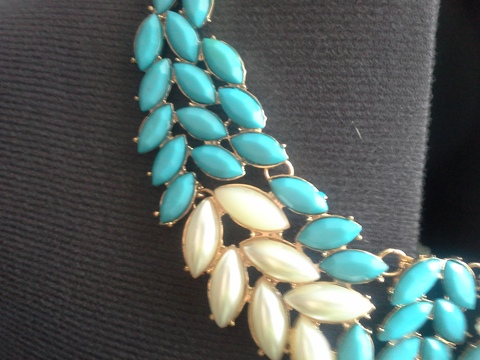 Teal and cream plastic bib necklace. I never wore this one, but I noticed that some of the shimmer has come off on one the the pieces, I have included a picture so that you can see. I am willing to throw this in as a "freebie" with another trade.