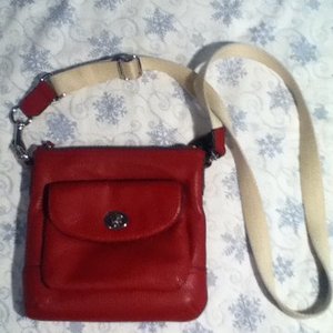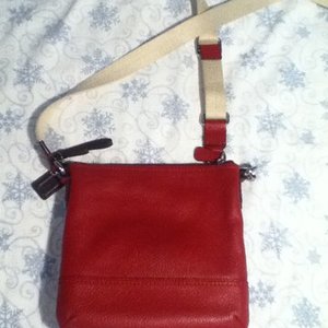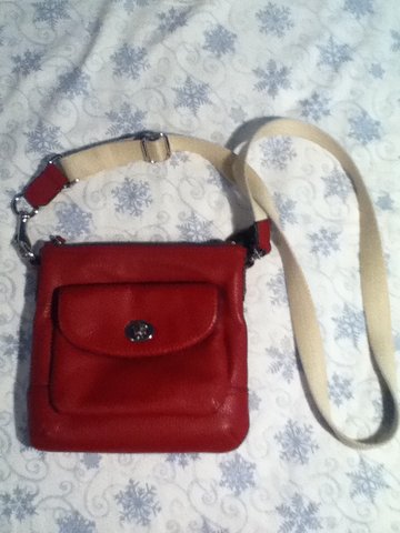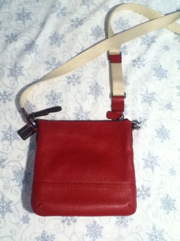 Only had it for a few months and barely used. I just have another purse I like better! It comes with the Coach care instructions as well. The main pocket is a zip closure and has one side pocket inside. The dark brown charms on the side are a bow and a tag that says Coach. The strap is adjustable and REALLY soft.