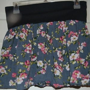 Loose, floral mini skirt with waistband. Can be worn with waistband up or folded down. Thin and lightweight! I think someone gave me this skirt. I've never actually worn it. Tag says large, but definitely fits more like a medium.