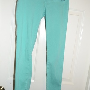 Turquoise pants with 4 zipper pockets (NOT REAL POCKETS) on the front. Look like jeans, but they're actually made of cotton, so they are soft. Tag says they are a size 25, which is a 0.