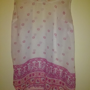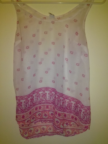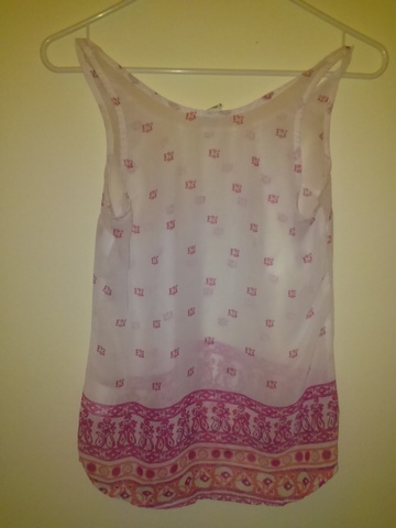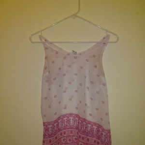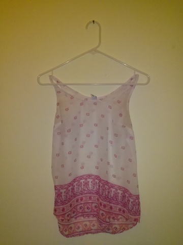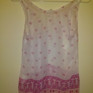 Pink and white patterned shirt. Thin strap. and sheer. Needs a under shirt. XS but it is lose so will fit comfortably. Great condition, and no stains, ware, or rips.