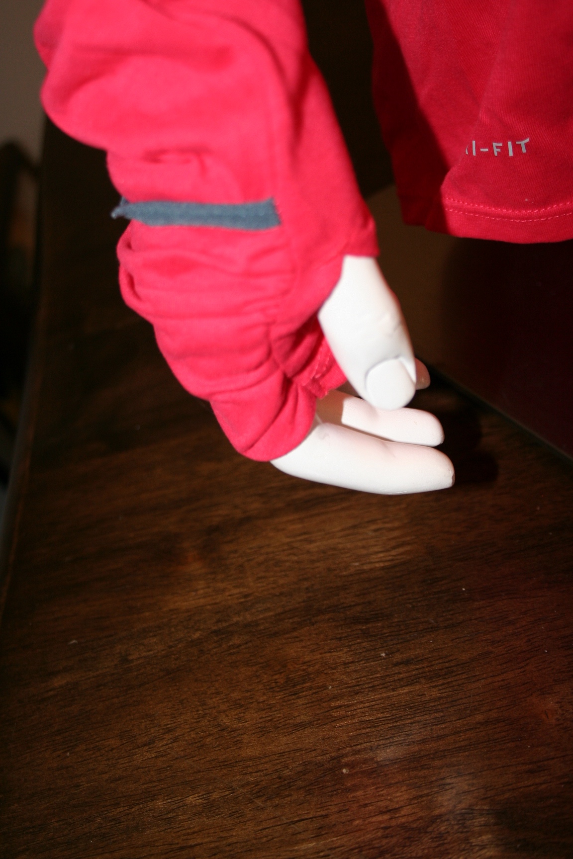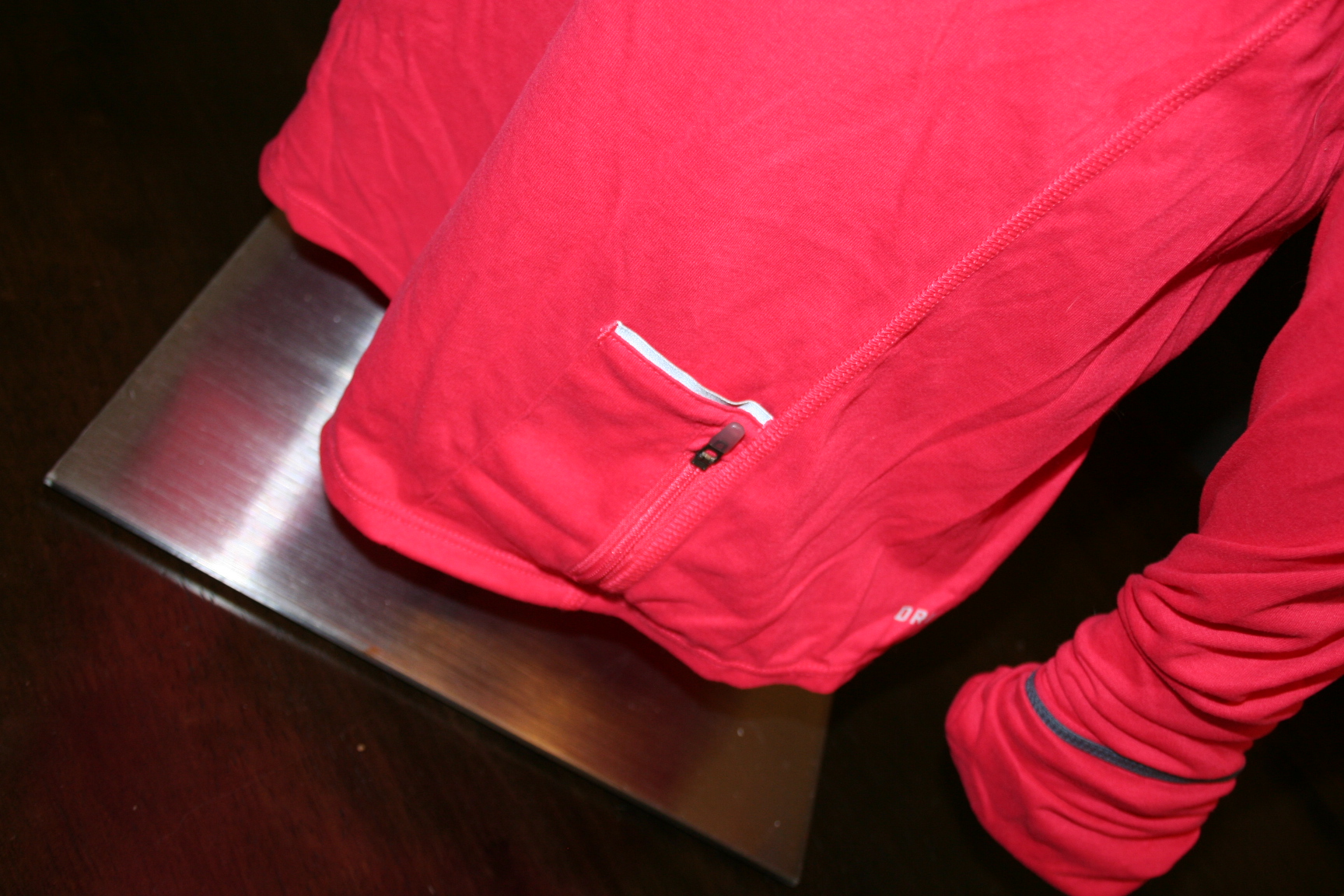 Check out the fine details. The sleeves have a mitten fold over for fingers when you're out on a cold run. There is even a cute zipper pocked at the back for any gels or chews for long runs. There is some very very minor scuff marking at the waist from my fuel belt, as all of my running tops have from long runs. Not noticeable at all.