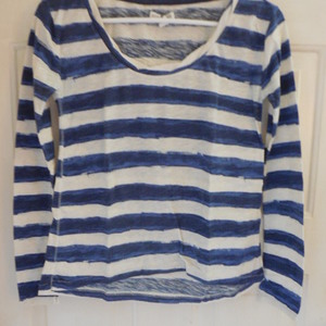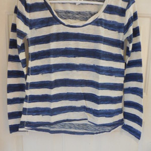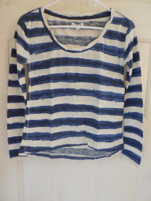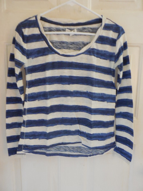 Aeropostale size small. Tee-Shirt top, white and medium/dark blue free form stripes, wide scoop neck, long sleeve. Very Good!