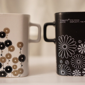 From a brand named "Tomato Juice". They remind me of swedish design and brands like Marimekko. I used them a lot but they've been washed a good few times, but be sure to check the pictures for the scrapes on the inside (esp of the white one.) They're really cute and small (probably hold 4oz of liquid.) Would be great as espresso mugs or pencil cups.