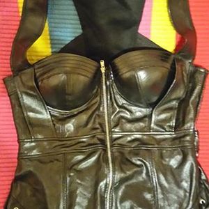 Shiny soft black polyester. Cute for a stylist outfit or for Halloween costume. Does have a zipper in the front. Size: It is a size SMALL but runs a little larger. If you have smaller breast, the top won't fit very well. Not very tight fitting for a small.