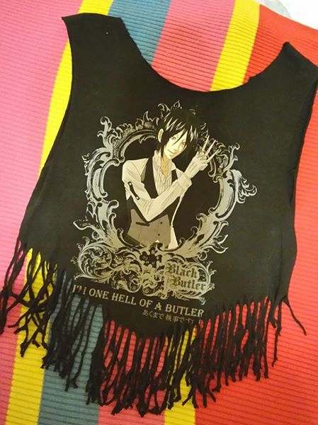 This shirt has been CUT and SHAPED, not original style. May be uneven. Black "Black Butler" anime graphic tank with logo "I'm One Hell Of A Butler" and the character Sebastian on front . Fits true to size. Will show stomach. Good for summer.